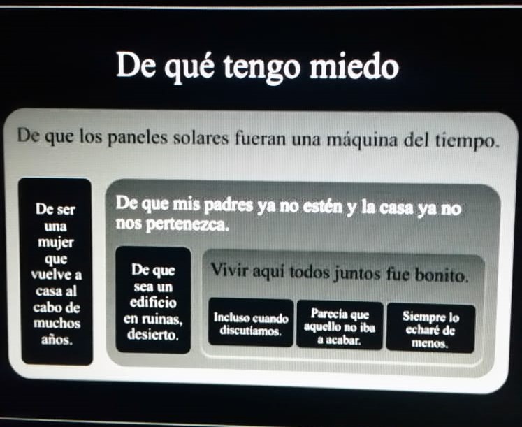 Este último código lo encontramos en el diario que Alison, la hija de 12 años de Sasha, escribe en el año 2000, en formato PowerPoint, como una presentación, en la que los iconos y las palabras son el vehículo con el que nos descubre sus sentimientos, que cobran mayor fuerza por la concisión del código empleado, proponiendo otro mundo narrativo, el mundo digital.