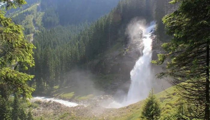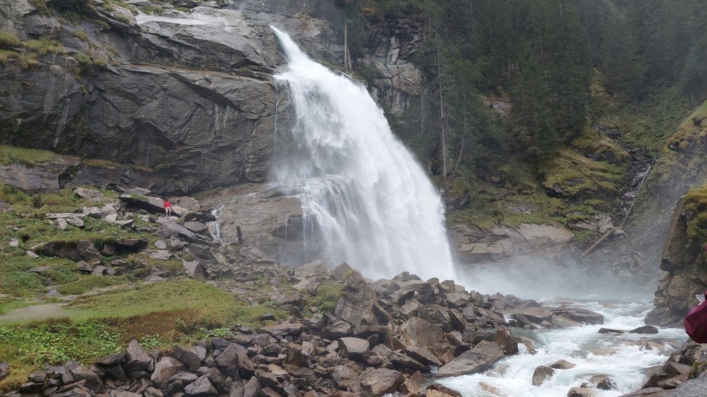 Una vez aparcado el coche, nos adentramos por un camino que nos llevaría a las espectaculares cascadas del río Krimml Ache y que desembocaba en una especie de plaza, La Kürsingerplatz, un espacio con numerosos edificios de madera en los que se encuentran la taquilla de entradas, la tienda de recuerdos, una pequeña cafetería y los servicios. Aunque es un espacio natural, está protegido y dotado de ciertas estructuras que tienen que ser cuidada y mantenidas; es por lo que hay que pagar una entrada para acceder a la zona de la cascada y subir los numerosos senderos que parten de su base y que nosotros no pudimos recorrer dada la hora y la lluvia pertinaz que caía. La catarata desciende en tres tramos, por lo que se pueden contemplar los saltos; en la primera fase la cascada cae 140 metros, en la segunda 100 metros y en la última fase cae otros 140 metros.