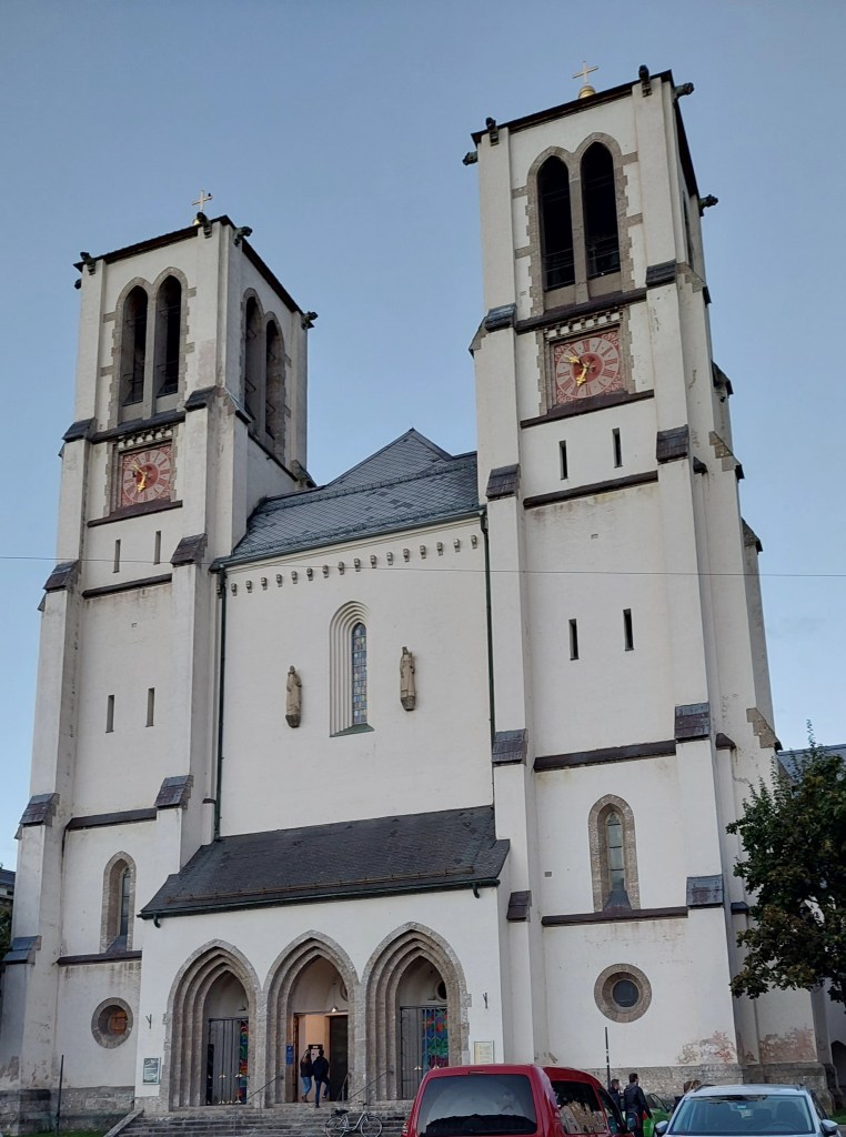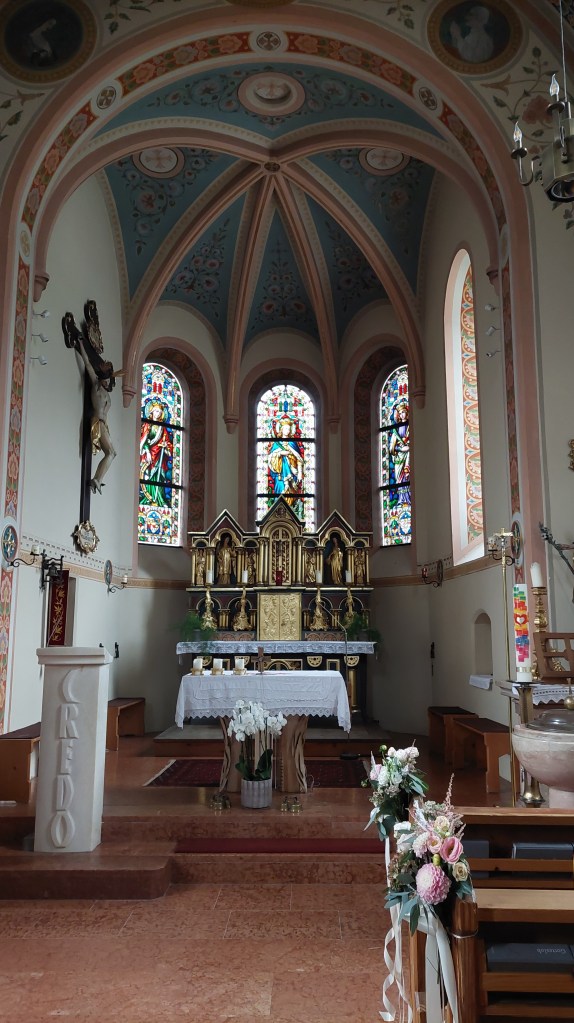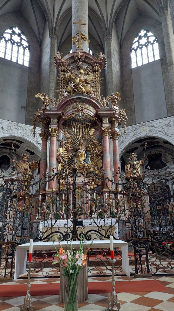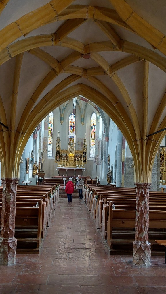 Siguiendo nuestro paseo, ascendimos por empinadas escaleras hasta la Pfarrkirche, una bonita iglesia católica, parroquia de Nuestra Señora de la Ascensión, de estilo gótico que se comenzó a construir alrededor de 1181.