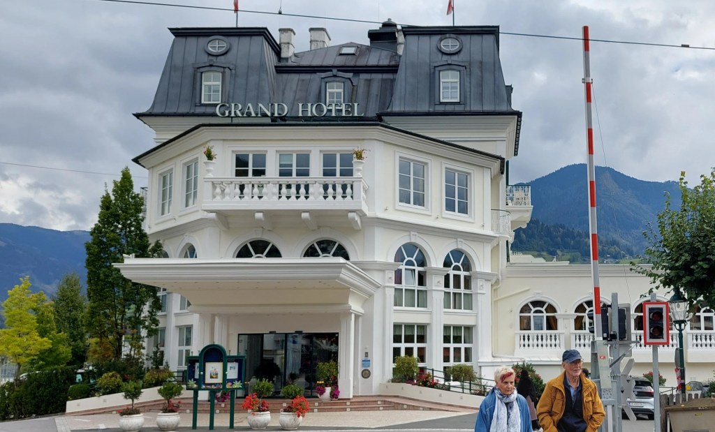 Ya de vuelta en Zell am see un tanto destemplados, decidimos tomar algo caliente en el hotel de 4 estrellas superior Grand Hotel Zell am See, un elegante edificio blanco situado en un lugar único, en una península privada en la orilla del Lago Zell, con playa exclusiva, coquetos jardines y una azotea con vistas panorámicas. En los salones de su cafetería Imperial abiertos al lago, nos sirvieron unos mojitos riquísimos y Aperol Spritz, que nos hicieron olvidar la lluvia y el tiempo desapacible.