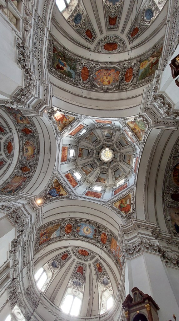 También nos dio tiempo a acercarnos a la Iglesia de la Santísima Trinidad, en la plaza Makartplatz, justo al lado del jardín Mirabell, una de las cuatro iglesias construidas por el arquitecto austriaco más famoso de la historia Fischer von Erlach, arquitecto también del Castillo de Schönbrunn, el monumento más visitado de Austria. Tiene una forma ovalada hacia dentro semejante a de la iglesia de la Universidad al otro lado del río, cuya entrada también en forma de óvalo, es hacia fuera.