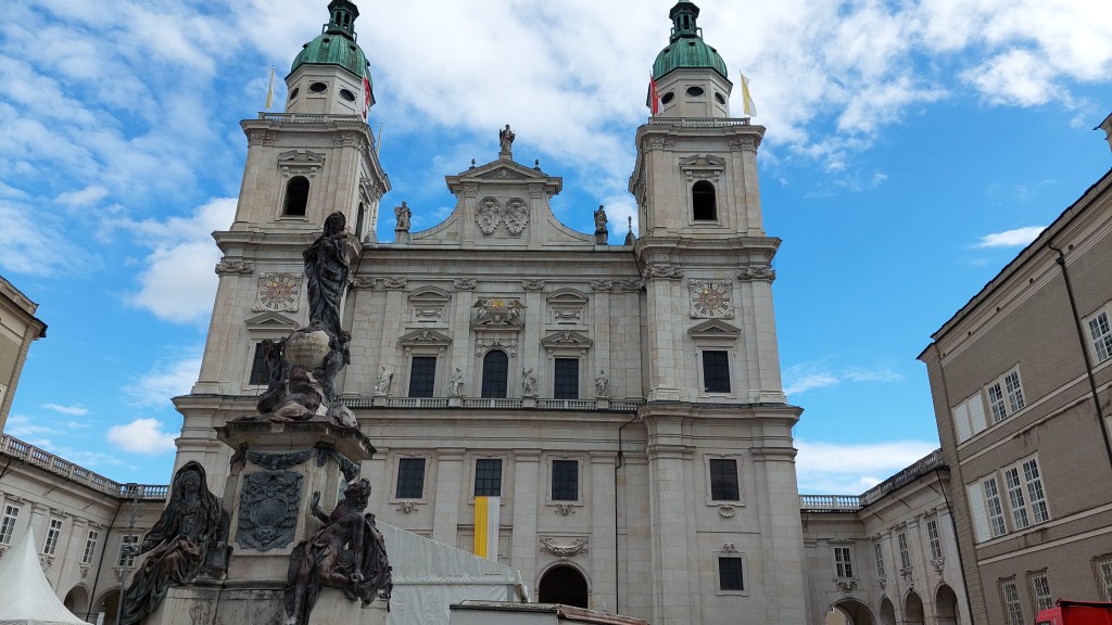 Comenzamos el paseo y nuestros pasos nos llevaron hasta Domplatz , plaza en la que se estaba celebrando la fiesta de la cerveza y donde se alza La Catedral de San Ruperto, edificio barroco del siglo XVII; fue diseñada por Santino Solari y construida sobre los cimientos de la antigua basílica, de la que aún se conservan la pila bautismal gótica del siglo XIV y el alero del estilo italiano.
