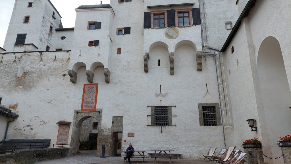 Subimos a la fortaleza en el funicular“Festungsbahn” que tanto en invierno como en verano, lleva directamente desde el corazón de la ciudad a la fortaleza, una de las más antiguas de Europa; una vez allí recorrimos la fortaleza deteniéndonos en su patio interior donde se encuentra la Capilla de San Jorge y paseando por sus torres, terrazas y murallas.