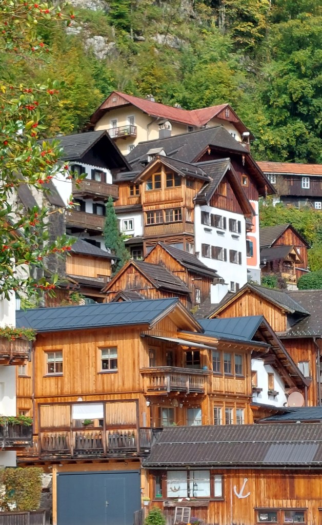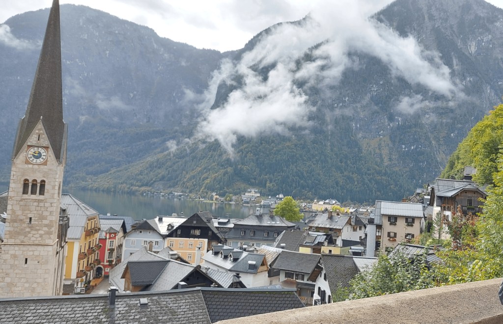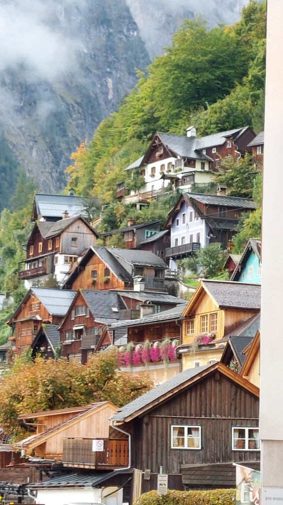 A la mañana siguiente, martes 27 de septiembre, aunque llovía copiosamente, decidimos emprender el viaje que teníamos programado hacia Hallstat, distante unos 73 km de Salzburgo. El viaje se hizo un poco pesado porque el GPS decidió “atrochar” como dicen los montañeros y nos metió por carreteras incalificables durante 30 Km, lo que retrasó la llegada a tan maravillosos lugar. Pero todo se nos olvidó, cuando tras dejar los coches en una zona de aparcamiento, nos dirigimos al pueblo y descubrimos un entorno de película, con casas de madera encaramadas en el monte, superpuestas unas encima de otras, con balconadas de madera tallada cuajadas de flores, y tejados puntiagudos de pizarra, y con un lago azul, Hallstätter, a sus pies, al que sólo ponía límite el verde de las montañas.