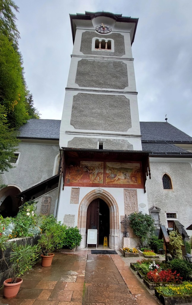En su parte trasera se encuentran un estupendo mirador y el bellísimo cementerio desde el que contemplan preciosas vistas y el Hallstätter Beinhaus, un pequeño osario que no pudimos ver con cerca de 1200 cráneos pintados con diversos motivos y otros tantos huesos.