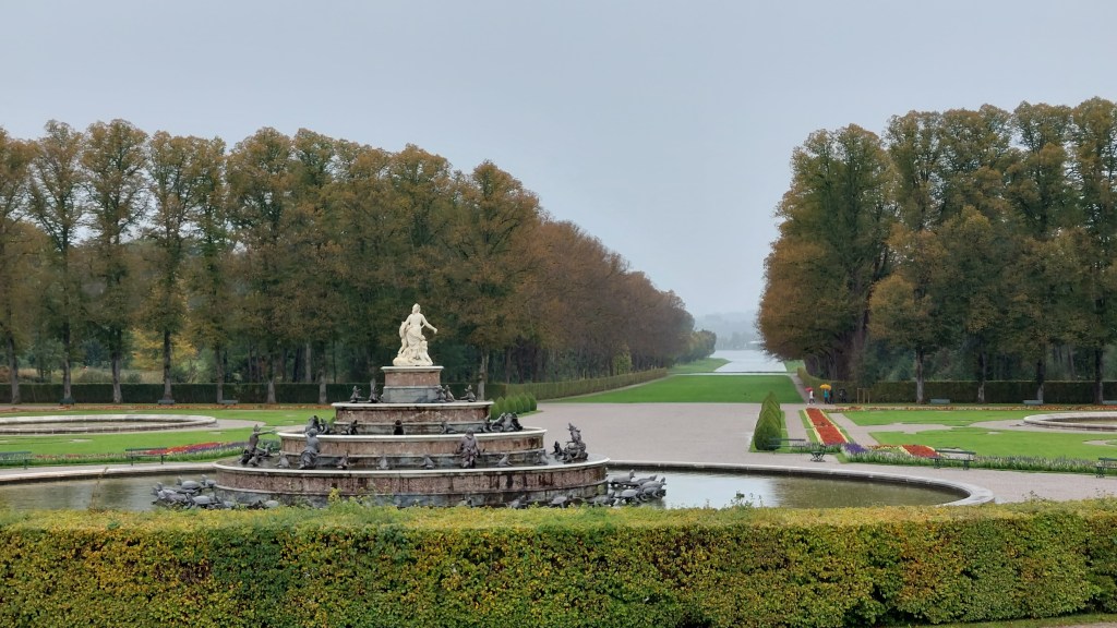 Llegamos al palacio atravesando un bosque, a tiempo de realizar la visita guiada por el palacio en la que recorrimos más de veinte salas ricamente decoradas, con suelos de marquetería, paneles de estuco de mármol, espléndidas pinturas en paredes y techos, muebles y preciosas lámparas; la sala más rica e impresionante, es la Gran Galería de los Espejos, una imitación casi perfecta de la «Galerie des Glaces» de Versalles. La sala tiene 98 metros de largo a lo largo del frente del jardín; espejos de pared, techos abovedados pintados al fresco, estuco dorado, 44 lámparas de piso y 33 brillantes lámparas de techo adornan el que probablemente sea el salón de baile más fastuoso del mundo. Pero lo que nos encantó fue la moderna cocina en la planta baja del Palacio, en la que el Rey, mandó instalar una plataforma levadiza que subía y bajaba la mesa del comedor, de un piso a otro; así, al subir la plataforma, aparecía la comida servida en los platos y bajaba para ser recogida en la propia cocina. ¡Toda una modernidad!