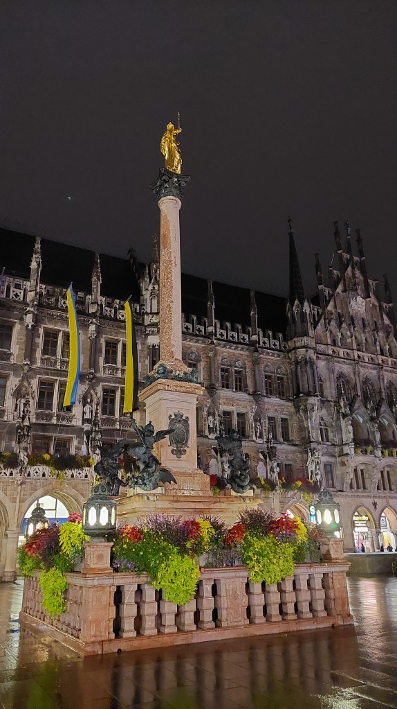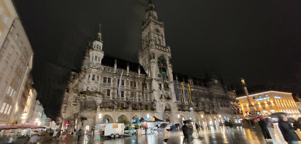 Como llegamos ya anochecido a la capital, nuestra primera visita fue a uno de los lugares más espectaculares de Múnich, la Marienplatz, la plaza más importante desde su fundación en 1158. El principal atractivo es la Altes Rathaus o Ayuntamiento antiguo, edificio gótico que desde hace más de 500 años contempla la bulliciosa vida de esta fascinante plaza; a pesar de ser construido entre 1470 y 1480, ha sufrido numerosas remodelaciones en su aspecto. Su apariencia sencilla contrasta con lo abigarrado del ayuntamiento nuevo pero mantiene la elegancia y el encanto de los castillos de cuento. El edificio cuenta con una torre de 55 metros que fue construida en el siglo XII como parte del sistema defensivo de la ciudad y que hoy alberga el Museo de los Juguetes (Spielzeugmuseum).