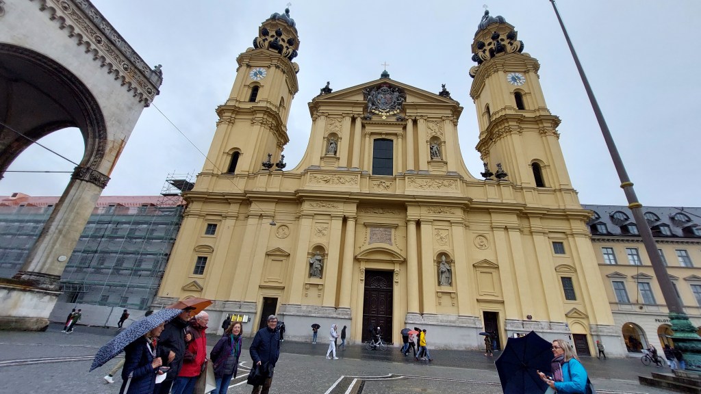 En el centro de la plaza encontramos el monumental Feldherrnhalle o “Pórtico de los Mariscales”. Esta impresionante obra fue mandada realiza por el rey Luis I y concebida por el maestro de obras Friedrich von Gärtner entre 1841 y 1844, siguiendo el modelo de la “Loggia dei Lanzi” de Florencia. Muy cerca del Pórtico se alza la iglesia de Los Teatinos, Theatinerkirche, edificada en 1663 en estilo barroco por el arquitecto italiano Agostino Barelli. Se distingue claramente en la laza gracias a su fachada de estilo rococó pintada de amarillo. Los Teatinos, era la iglesia de la corte, por lo que alrededor de 50 miembros de la dinastía bávara, están enterrados en la cripta. La leyenda cuenta que los miembros de la realeza eran enterrados sin sus corazones y que éstos se enterraban en una capilla especial; pero este increíble hecho está sin constatar, así que ahí lo dejamos.