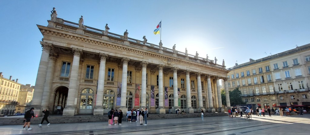 El miércoles por la mañana concertamos un «Free Tour» para descubrir peculiaridades de la ciudad que sólo los guías revelan y seguir descubriendo lugares como La Plaza de la Comedia, en el corazón del casco antiguo, donde se ubica el Gran Teatro, uno de los monumentos más importantes de la ciudad, construido en estilo neoclásico en 1780; el edificio rectangular muestra en su fachada un peristilo de doce columnas corintias que sostienen un entablamento y una balaustrada decorada con doce estatuas (las nueve musas y tres diosas). Actualmente, es la sede de la Ópera Nacional y el Ballet Nacional de Burdeos .