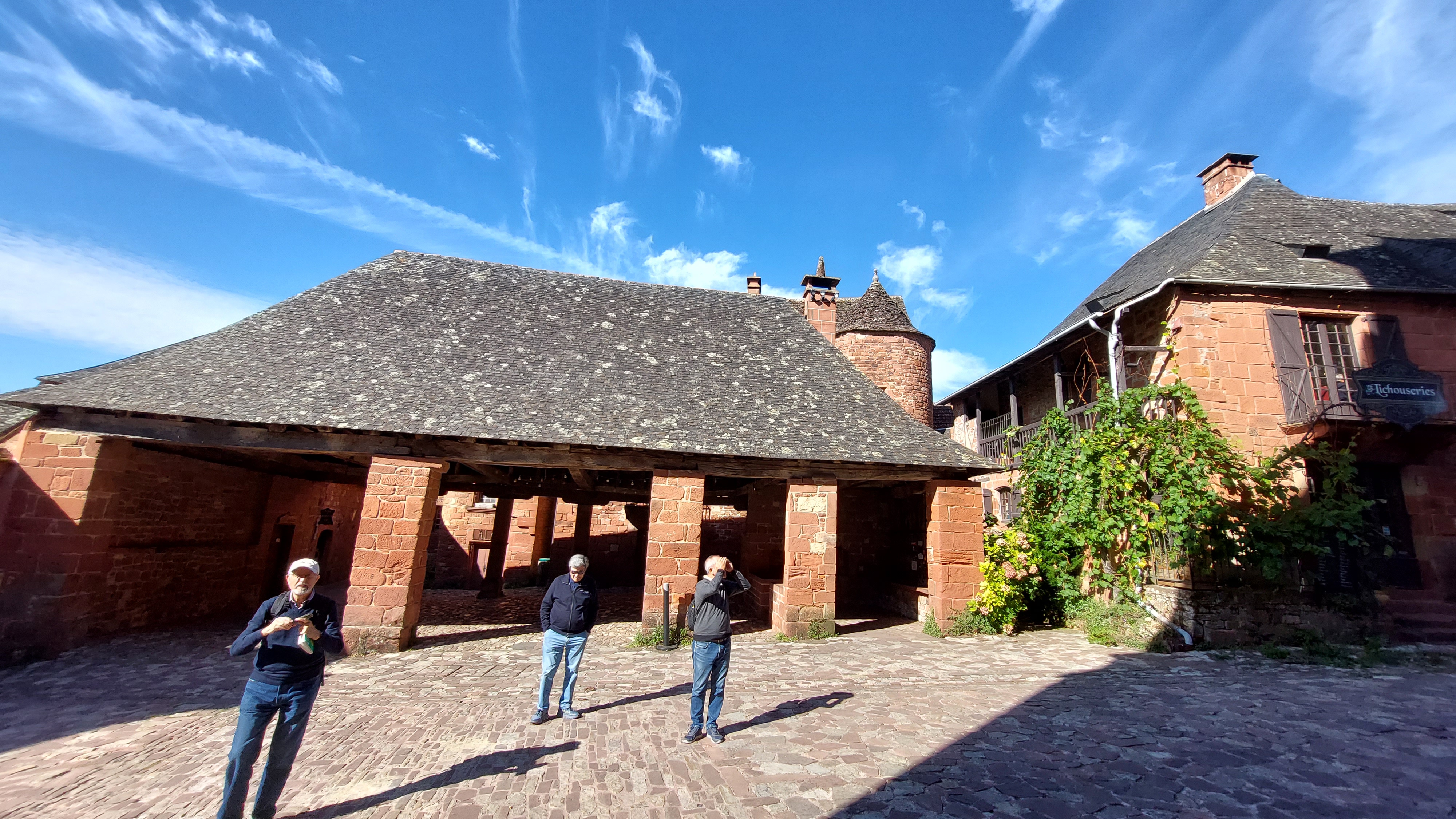 Caminando por sus bonitas callejuelas pudimos contemplar las fachadas y tejados de pizarra de las suntuosas residencias de los siglos XV y XVI, todas ellas cubiertas de torres y torrecillas; así mismo el mercado de granos y vino del siglo XVI y la Iglesia de San Pedro, construida en piedra arenisca roja entre finales del siglo XI y principios del siglo XII, con su espléndido tímpano del siglo XII esculpido en piedra caliza blanca y su imponente campanario ejemplo del románico lemosín. Posteriormente en el s. XVI fue fortificada y aún hoy conserva vestigios de esta arquitectura defensiva.