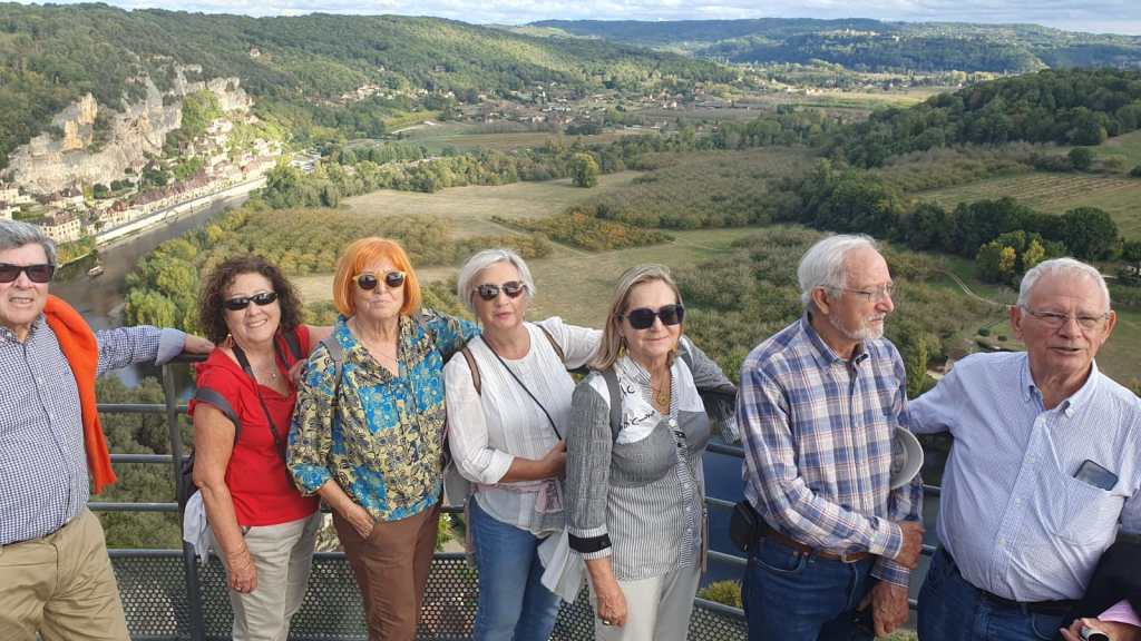 Inmediatamente después fuimos a ver les JARDINES DE MARQUEYSSAC, declarados bien de interés público por la singularidad de sus más de 6 kilómetros de paseos, en los que resalta el arte topiario del jardín; está bordeado por 150.000 bojes centenarios, podados a mano, que rodean un coqueto castillo de principios del siglo XIX, cubierto por un tejado de lajas de piedra; los jardines están adornados por rocallas, cabañas de piedra, cabezas de piedra hundidas en la tierra y unos magníficos miradores que le han convertido en el jardin más visitado del suroeste de Francia. Por su ubicación, encaramado en lo alto de un saliente rocoso, se le conoce como el Mirador de Dordogna, ya que proporciona una de las vistas del Périgord más impresionantes del valle. Tras caminar por el bellísimo jardín unos cuatro kilómetros, volvimos al castillo para visitarlo y concluir una jornada en la que descubrimos pueblos y castillos de una belleza extraordinaria. Terminada la visita volvimos a los coches para llegar temprano al hotel y cenar allí en el restaurante del golf donde degustamos paté y quesos de la zona.